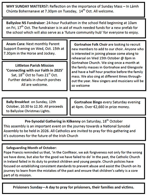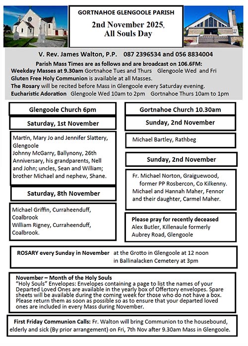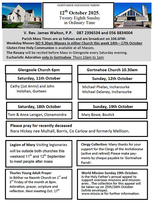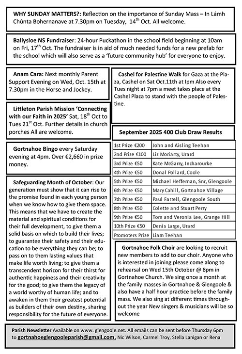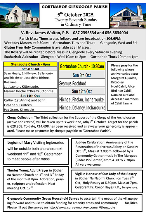 PARISH NEWSLETTER All emails can now be directed before Thursday 6pm to: gortnahoeglengooleparish@gmail.com or to: Nic Wilson, Carmel Troy, Stella Lanigan and Rena Ryan.